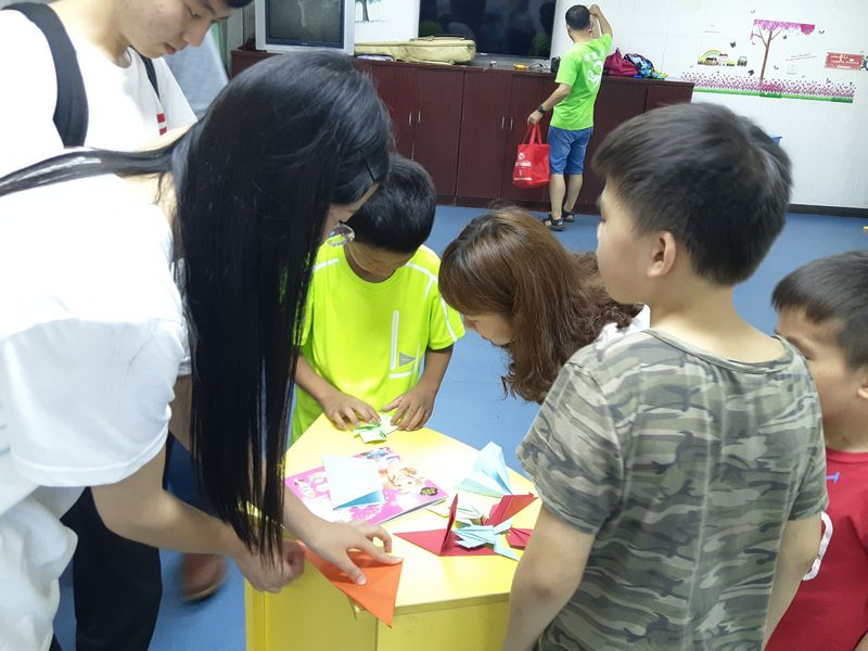 为了让孩子们感受到中国传统文化的魅力,服务团一行人在团总支书记张铁红老师的带领下还开展了生动有趣的折纸游戏。在活动过程中,张铁红老师与志愿者们向孩子们分发了手工材料,并手把手地教孩子们折各种生活中的事物,例如青蛙、飞机、爱心等。这种让孩子们的多种感官共同参与的活动锻炼了孩子们双手的灵巧性,启迪了孩子们的想象力、观察力与创造力。