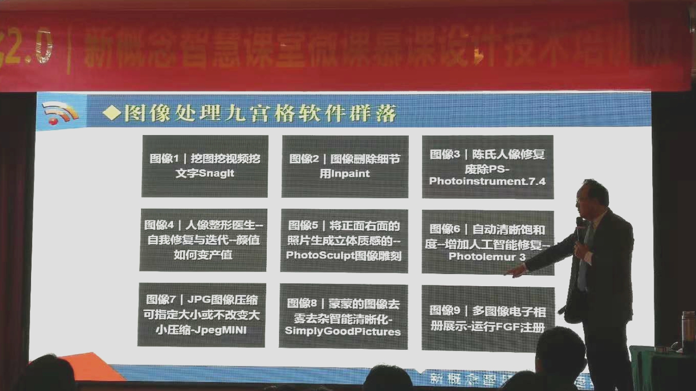 本次培训中,桂林理工大学多媒体软件开发与应用研究所所长、教育部“全国教师信息技术培训(TITT)”讲师陈三明教授透过两天十个专题的现场高密度讲座,讲解了如何使用多种软件快速协同设计制作微课程,并借助于新概念微课程快捷技术体系,让一线教师能快速成为交互式微课程制作高手,提升教师第一课堂的教学展示能力。