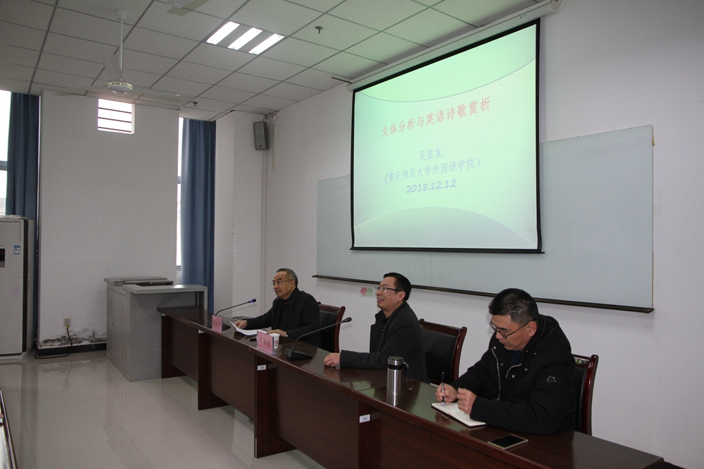 12月12日,应公司邀请,重庆师范大学太阳成集团tyc33455cc经理吴显友教授在格术楼A701为公司部分师生作了题为《文体分析与英语诗歌赏析》的讲座。讲座由公司经理刘安洪教授主持。