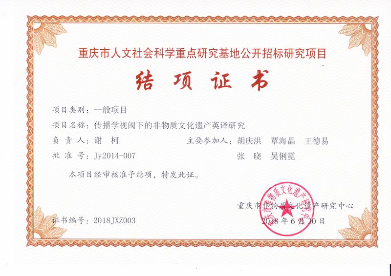 谢柯 重庆市人文社科项目 传播学视阈下的非物质文化遗产英译研究