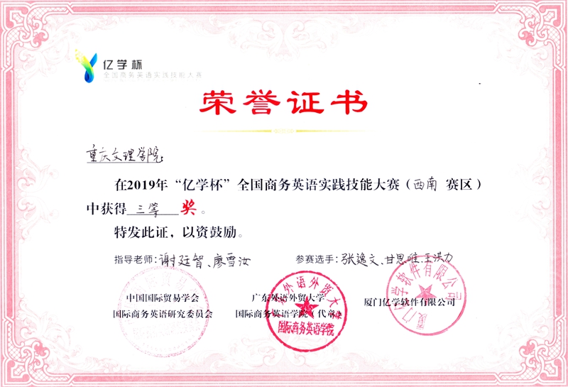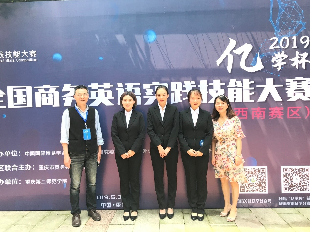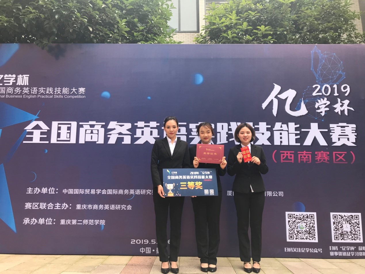 5月31日-6月1日,2019年“亿学杯”全国商务英语实践技能大赛(西南赛区)在重庆第二师范公司举行,来自四川外国语大学、西南财经大学等高校的17支代表队参加了本次大赛。公司商务英语专业大二员工张逸文、甘思维和王洪力三名同学,在商务英语教研室谢廷智和廖雪汝老师的指导下,经过精心准备,反复演练,通过平台竞赛和现场展示两个环节的激烈竞争, 最终获得三等奖。