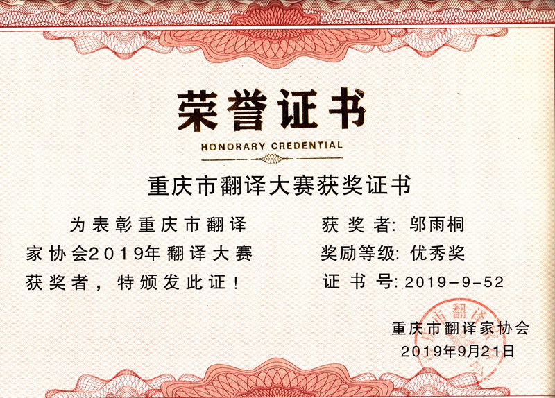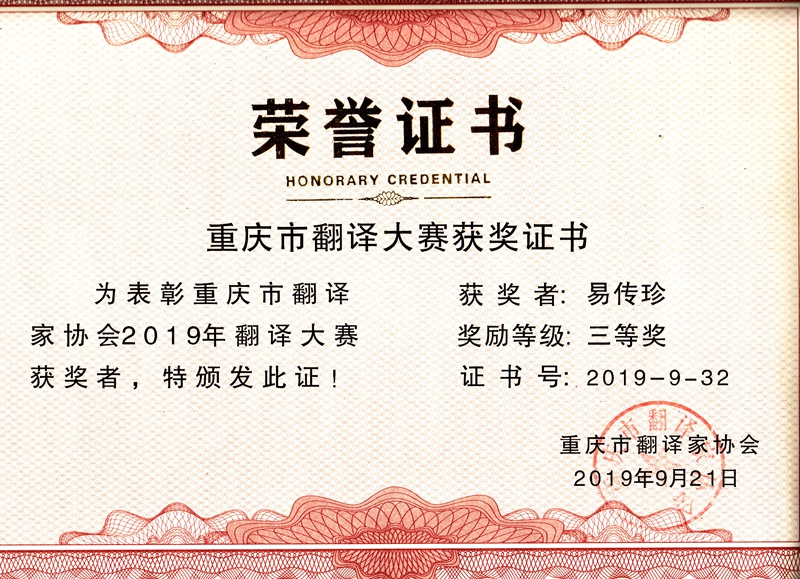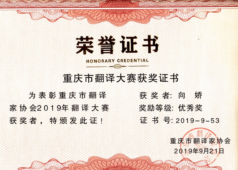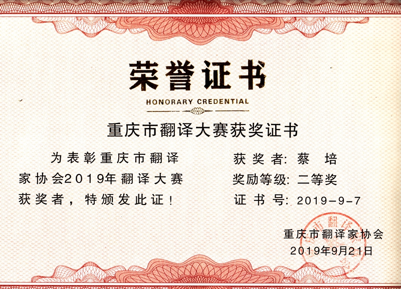 本次颁奖活动由重庆师范大学太阳成集团tyc33455cc副经理、重庆市翻译家协会副会长王方路主持。此次翻译大赛得到了相关单位、各高校的积极响应,收到来自15个单位(高校、翻译公司)共计1200余参赛选手的译文,经过专家认真评审,公司蔡培同学、易传珍同学分别荣获了二等奖和三等奖,邬雨桐和向娇两位同学荣获优秀奖。
