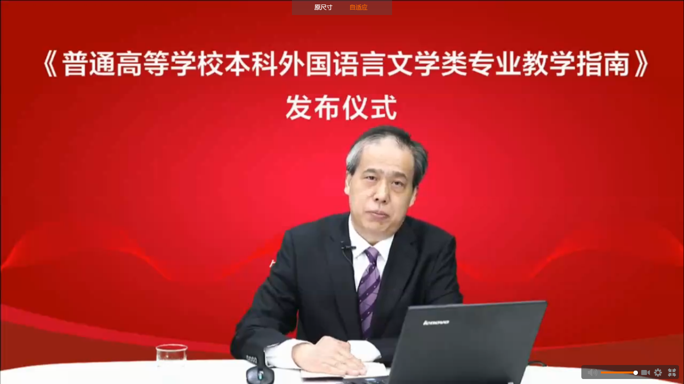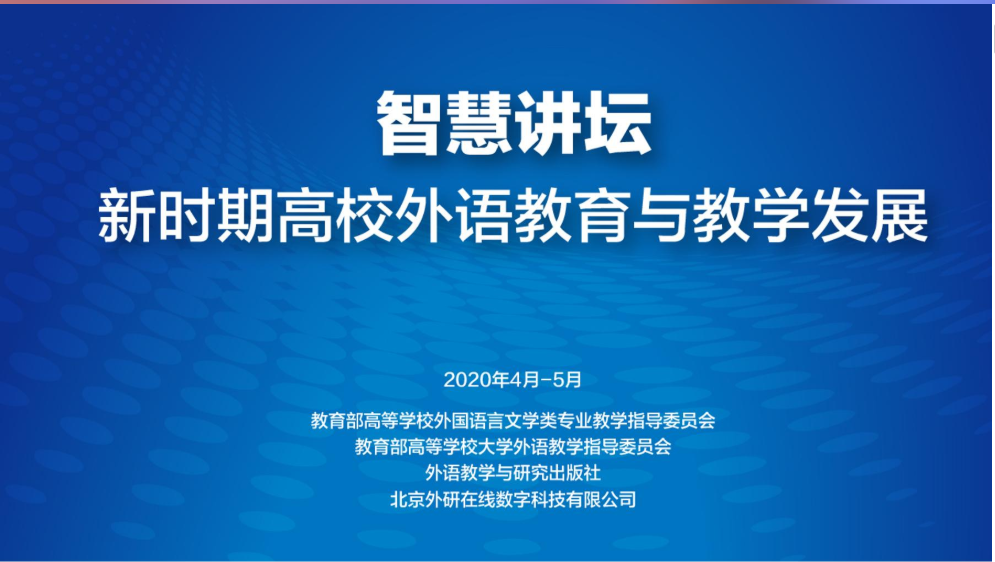 4月25日,由教育部高等公司外国语言文学类专业教学指导委员会、教育部高等公司大学外语教学指导委员会、外语教学与研究出版社、北京外研在线数字科技有限公司共同举办的系列“智慧讲坛”开讲。全国近1300所院校的2000余位外语教学管理者、外语教师齐聚云端,共话外语教育时代命题,共商外语教育发展大计,公司副经理胡庆洪、刘俊玲,教学办主任张鹏以及全体教研室主任参加了线上讲坛。