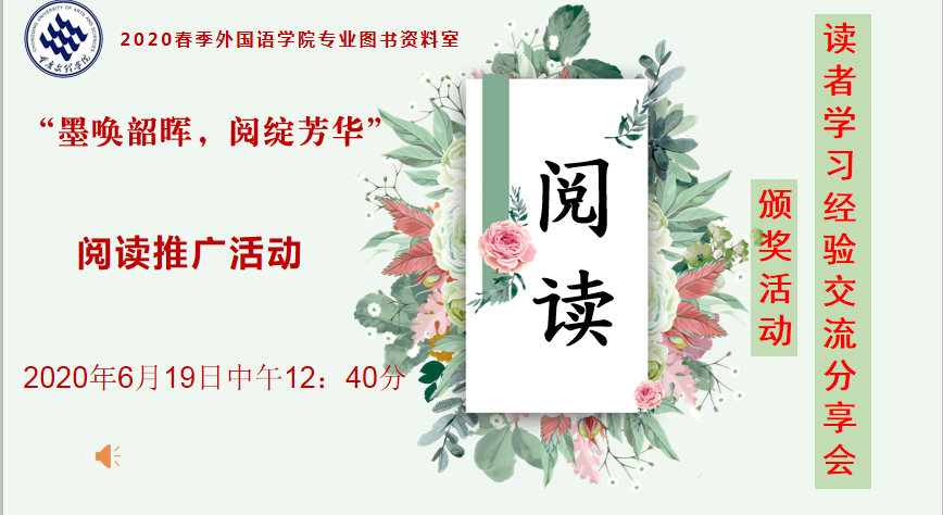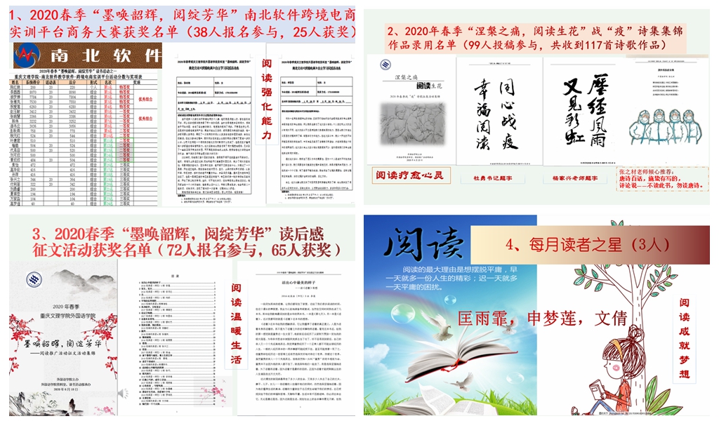 公司资料室从2020年1月8日开始,就开展了一系列线上阅读推广活动。一是2020年1月8日至3月30日利用南北公司商务软件,开展的“墨唤韶辉,阅绽芳华”商务英语专业线上跨境电商自主实践活动,38人报名,陈红艳、 李圆圆、胡梦婷、张雅岚、祝爱莲等25人获奖,并评出最佳组合和优秀组合。二是迎接世界读书日的4月1日-4月23日开展的线上2020年春季“涅槃之痛,阅读生花”战“疫”诗歌征集活动,战“疫”诗歌99人参与,共收到117首诗歌原创作品和3幅书法作品。三是庆祝“五四”青年节的5月6日-6月8日的线上线下“墨唤韶辉,阅绽芳华”读后感征文活动,72人报名,黄海格等68人获奖。四是6月12日开展的2019年年度“读者幸福指数调查问卷”活动。公司阅读推广活动真正实现了“阅读强化能力”、“阅读疗愈心灵”、“阅读温暖生活”“阅读成就梦想”的读者服务功能。