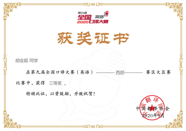 2020年8月29至30日,由中国翻译协会主办,中国翻译协会语言服务行业创业创新中心和北京甲申同文翻译有限公司共同承办的第九届全国口译大赛(英语)西部赛区大区赛落下帷幕,来自重庆、四川、云南、贵州、宁夏、青海、甘肃、新疆、陕西、广西、海南11省市各高校的216名选手参加了此次西部大区赛竞赛。公司代表队3位选手准备充分,沉稳冷静,凭借扎实的专业功底和出色表现全部获奖,其中郭歌荣获二等奖,胡会超和王洪力荣获三等奖。