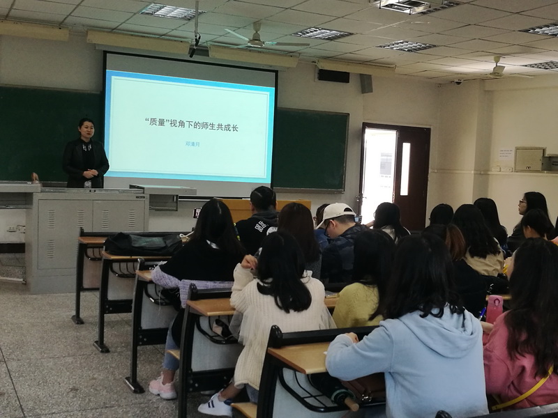 10月23日上午,永川兴龙湖中学副董事长邓清月应邀在知津楼D205为2018级英语(师范)专业员工做了题为“‘质量’视角下的师生共成长”讲座,讲座由公司副经理刘俊玲主持, 杜玲、吴旭、林艳青老师一起聆听了讲座。