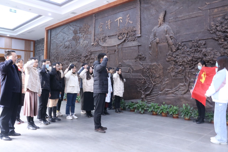 最后,在支部书记邹盛瑜老师的领誓下,支部全体党员在喻茂坚纪念馆大型展厅,面向党旗庄严宣誓。接着,党总支书记杜勇为本年度新发展的员工党员发放入了党通知书和党徽。