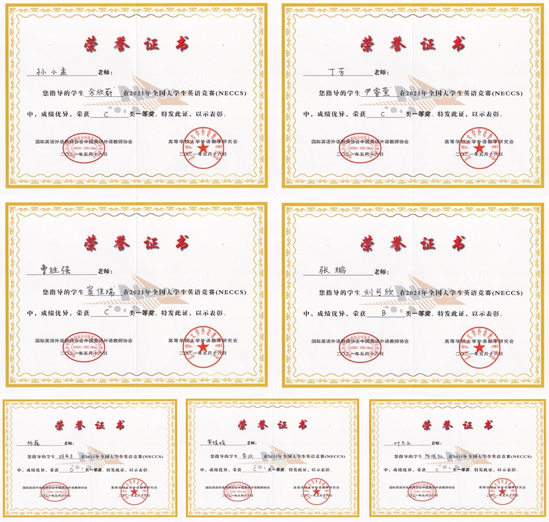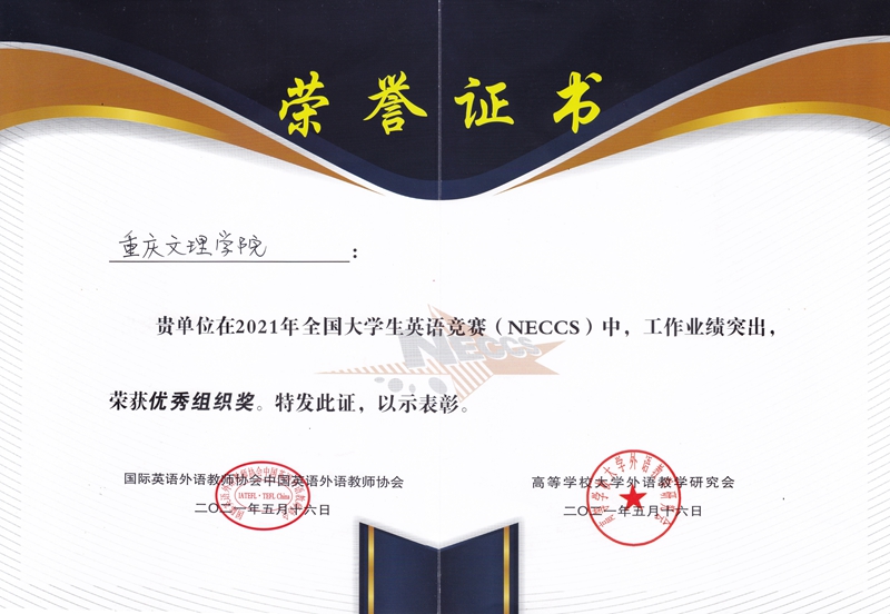 近日,从全国老员工英语竞赛组委会获悉,公司学子在2021年全国老员工英语竞赛重庆赛区中,共获得一等奖7项,二等奖36项,三等奖59项,公司荣获“优秀组织奖”称号,公司太阳成集团tyc33455cc教学办主任张鹏荣获“优秀组织奖”个人荣誉称号。