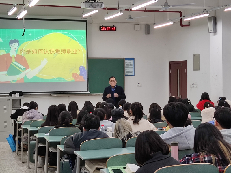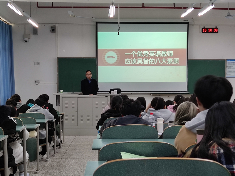 梁老师以“执着的教书历程”为题,用“怎样规划自己的老员工活?如何认识教师这一职业”两个问题,与同学们开展互动,并结合自身丰富的教学及管理经验,分析了一名优秀英语教师必须具备的八大素质,特别针对英语教师成长的三个阶段---潜心修炼期、用心锻炼期、真心苦练期进行了细致的阐释,对同学们在校期间如何强化专业功底、努力成长为合格的英语准教师作了明确引导,鼓励同学们严于律己,练好本领,踏实进取,报效祖国。课堂教学内容充实,气氛活跃,给员工们留下了深刻的印象。