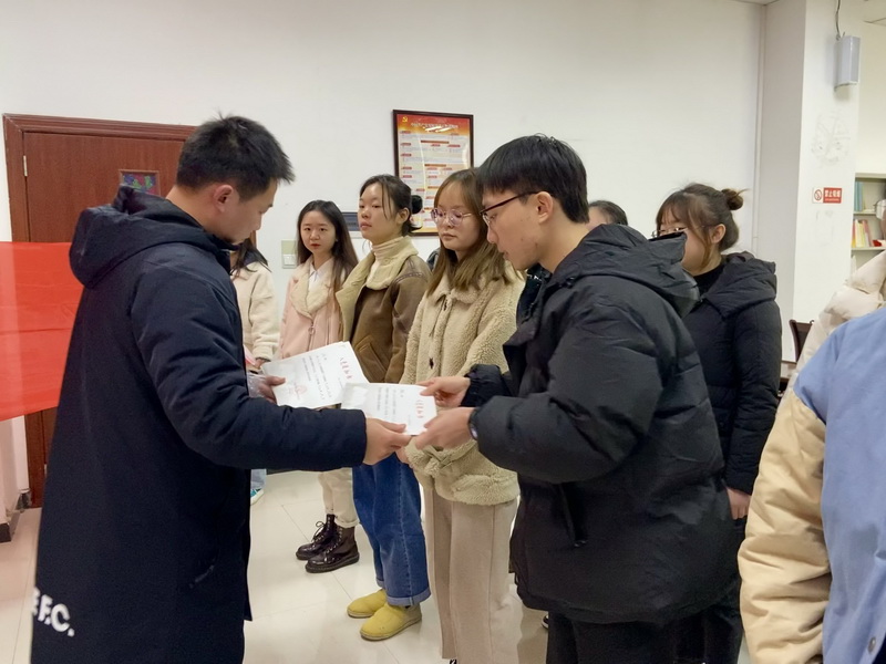 宣誓仪式在响亮的《国歌》声中开始,支部书记邹盛瑜带领大家,举起右拳面向党旗宣誓。宣誓结束后,邹盛瑜向新发展发放了入党通知书和党徽,并希望同志们不负党组织的期望,牢记党的宗旨,发扬党的优良传统,创先争优,争当一名合格的共产党员。他们纷纷表示,在中国共产党成立100周年这个特殊的日子里,加入中国共产党,倍感荣幸和自豪,定当不忘初心,牢记使命,刻苦学习,勤奋工作,为实现中华民族伟大复兴的中国梦不懈努力!