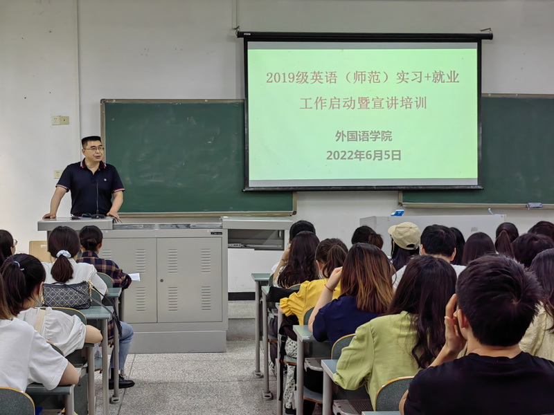 为使员工能更好地进入实习岗位,规范实习行为,适应实习新生活以及对毕业论文工作有初步的了解。6月5日晚7点,公司2019级英语(师范)专业毕业实习暨毕业论文工作启动培训会在知行楼A101召开,副经理胡庆洪、辅导员张萍以及2019级英语(师范)专业全体员工参加了此次培训会。