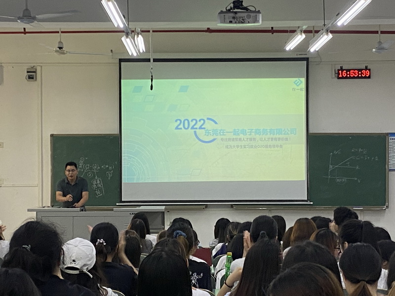 5月29日下午,公司邀请东莞在一起电子商务有限公司,在知行楼A106教室开展访企拓岗专项活动暨毕业实习+就业动员宣讲会。东莞在一起公司校企合作部主任张腾先、公司党总支书记杜勇、副经理胡庆洪、2019级商务英语专业辅导员邹盛瑜、以及员工140余人参加了此次宣讲会。会议由杜勇主持。