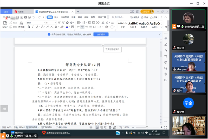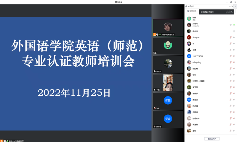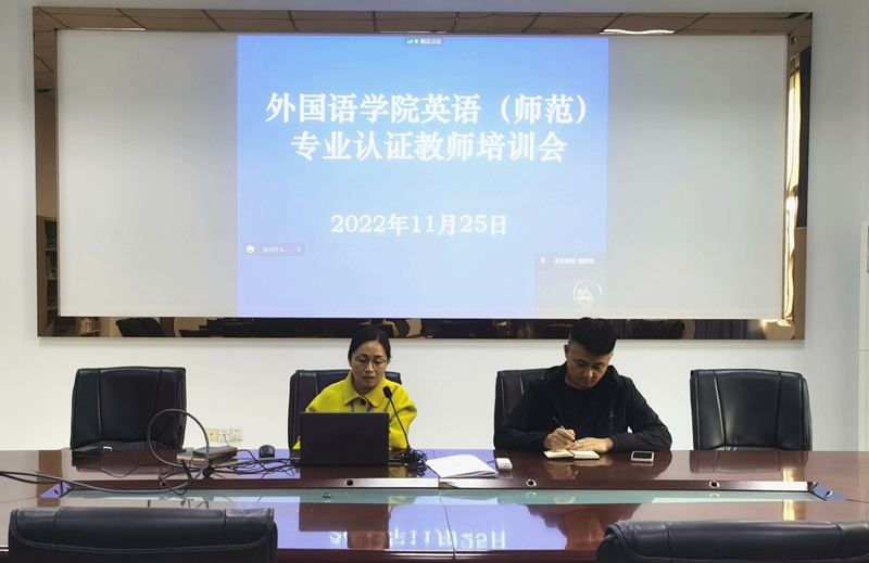 11月25日下午,公司在格术楼C603会议室召开了英语师范专业认证线上考查教师培训会。会议采取线下线上相结合的形式进行。公司教学办主任张鹏、英语师范教研室全体教师参加了培训,会议由公司副经理刘俊玲主持。