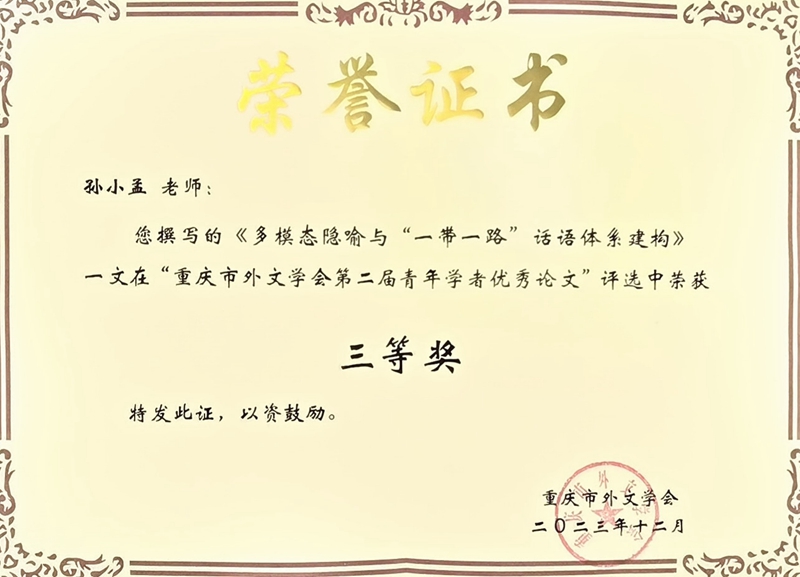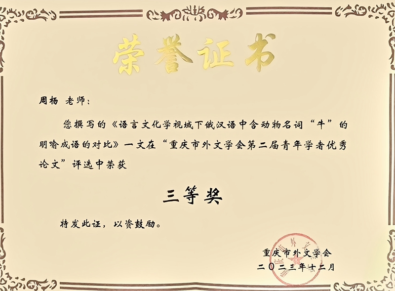 闭幕式上,主持人四川外国语大学赵永峰教授宣读了“重庆市外文学会第二届青年学者优秀论文”评选结果。公司孙小孟老师撰写的《多模态隐喻与“一带一路”话语体系建构》、周杨老师撰写的《语言文化学视域下俄汉语中含动物名词“牛”的明喻成语的对比》两篇论文喜获三等奖。