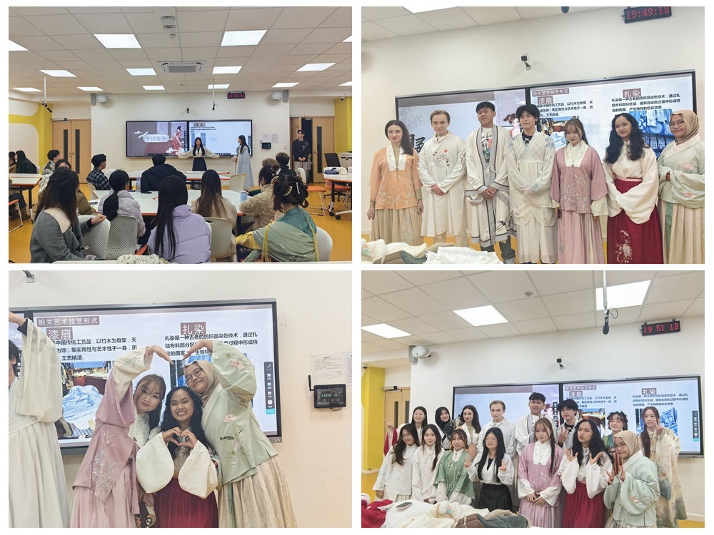 活动首先通过视频展示了中国服饰的演变历程和多民族服饰的特色。赵吉祥、黄文萍展示了马面裙、旗袍等传统服饰和藏族、苗族等少数民族的特色服饰,并进行了详细介绍。李佳怡介绍了中国传统技艺——漆扇和扎染的特点,传授了制作方法。互动交流中,在场同学兴致勃勃地体验了中国传统服饰穿戴,中外员工还在工作人员的帮助下一起制作了扎染和漆扇作品。本次活动加深了职工对中华服饰文化的认识和理解,体验了丰富的中国服饰文化魅力,同时也为促进中外员工交流搭建了平台,帮助职工更好地融入中国,更有效地传播中国文化。
