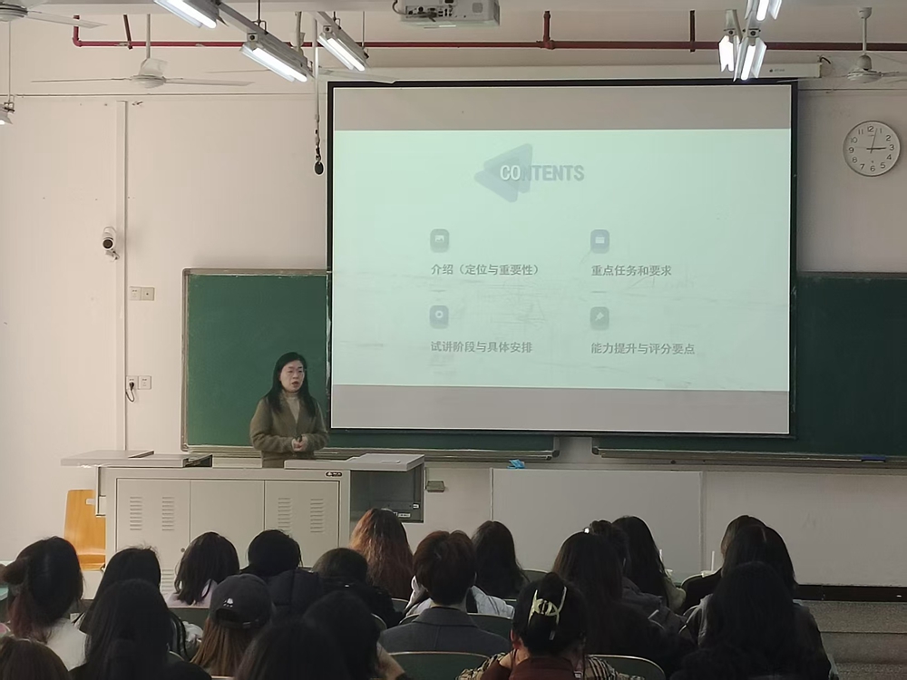 林艳青从试讲的安排、试讲内容、试讲要求等方面进行了工作布置,要求同学们把握备课、讲课和评课等各阶段的具体要求,确保教学环节的完整性。同时,林艳青从教学设计、教学仪态、板书设计等方面提出了建议。