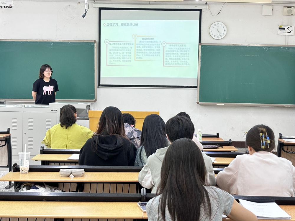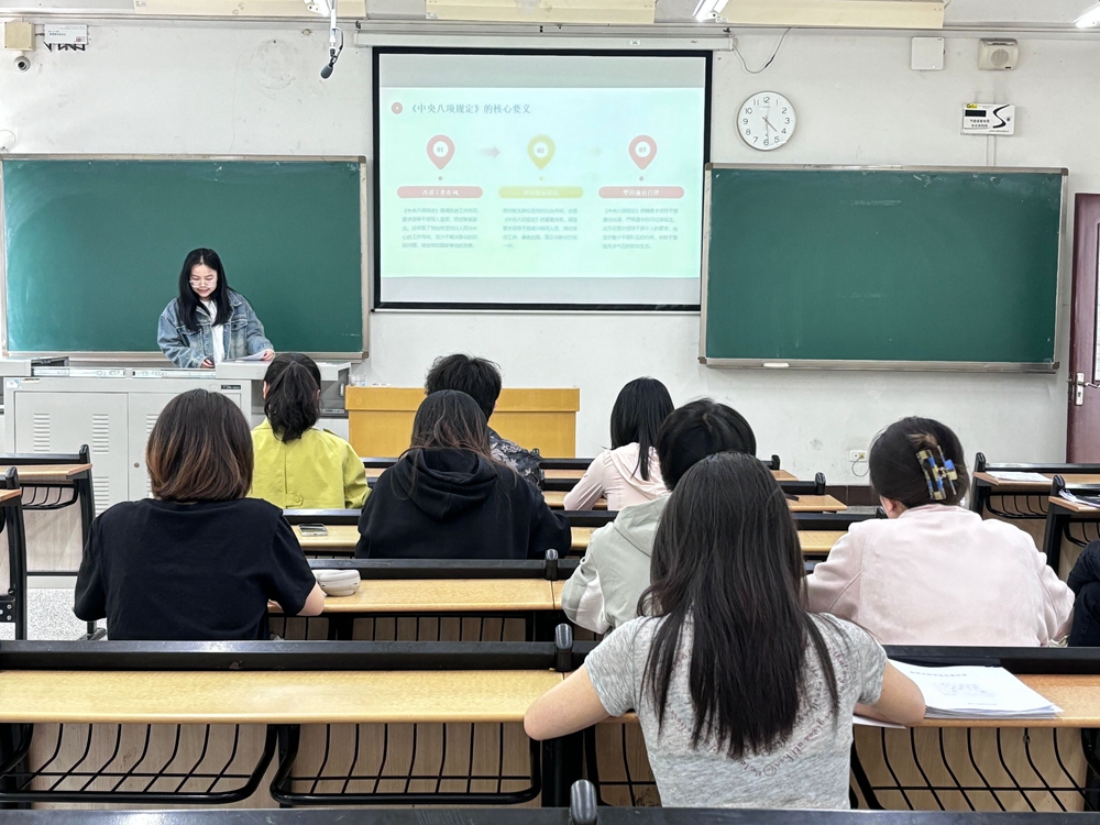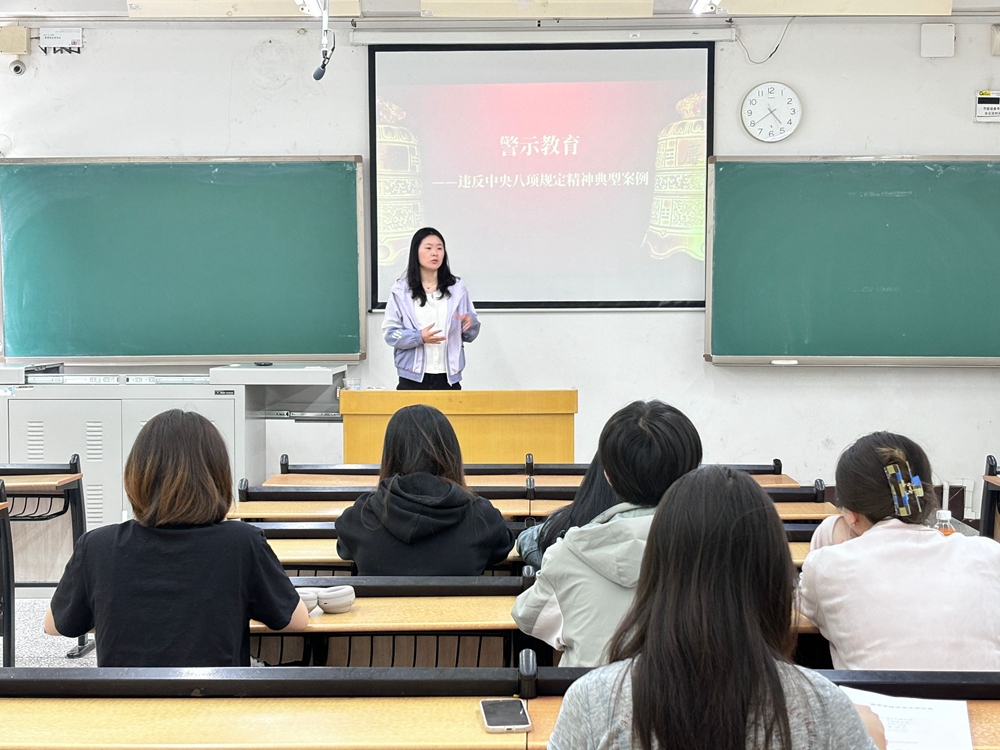 最后,陈晶结合近年来违反中央八项规定精神的典型案例开展警示教育,要求全体党员以这些案例为镜,警醒自身,切实发挥带头作用,无论是在课堂学习中,还是在日常生活和工作中,时刻将八项规定精神内化于心、外化于行,做到自律自觉、清廉务实。