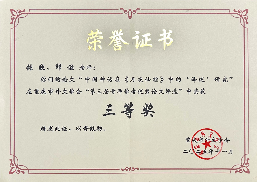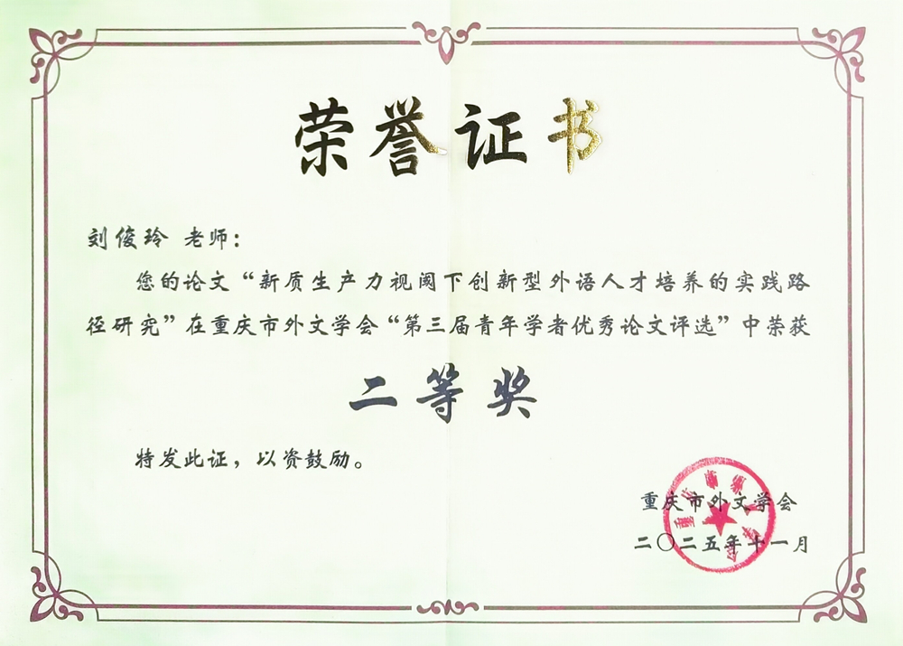 “重庆市外文学会第三届青年学者优秀论文评选”活动中,公司教师表现优异。刘俊玲撰写的论文《新质生产力视阈下创新型外语人才培养的实践研究》荣获二等奖,张晓、邵谧撰写的论文《中国神话在<月夜仙踪>中的“译述”研究》荣获三等奖,充分展现了公司青年教师的扎实科研能力与学术水平,为公司赢得了荣誉。