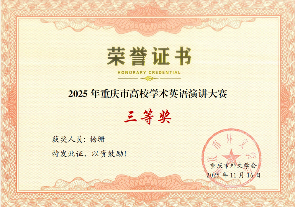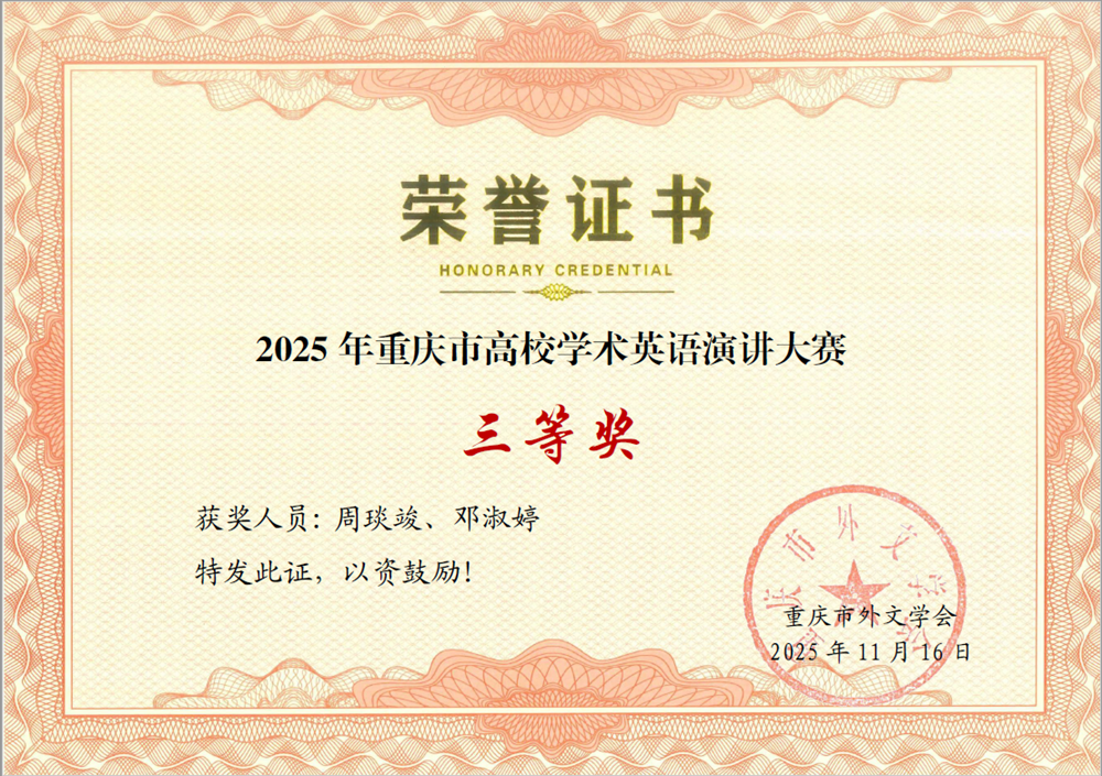 近日,由重庆市外文学会主办的首届重庆市高校学术英语演讲大赛落下帷幕。公司学子杨珊、周琰竣、邓淑婷分别荣获三等奖。