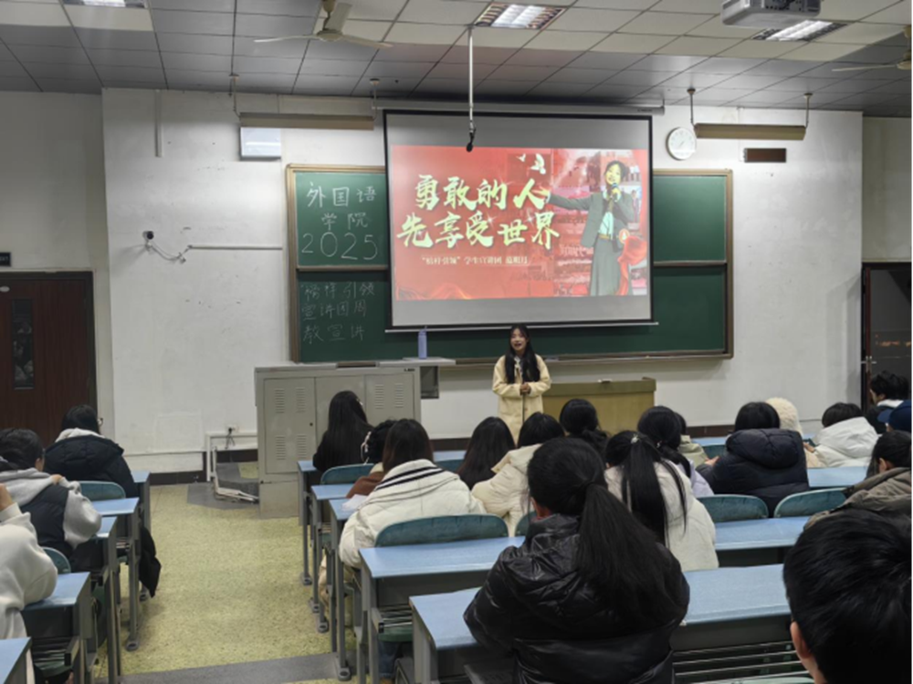 宣讲中,范明月以“勇敢的人先享受世界”为主题,结合自身担任员工干部、积极参与各类竞赛并荣获49项奖项的实践经历,深刻阐释了“行动胜于空想”的理念。她鼓励新生勇于尝试、不畏挫折,在持续实践中拓宽成长路径。其富有朝气和思辨的发言赢得了现场师生的广泛共鸣与热烈掌声。陈露佳聚焦“携笔从戎绽芳华,青春报国正当时”,深情回顾了五年军旅生涯的锤炼过程。从荣获“四有”优秀士兵称号到出色完成各项任务,再到退役复学后发扬军人作风、力争学业卓越,她以实际行动充分展现了军营所锻造的坚定意志与责任担当,激发了同学们热爱祖国,献身国防情怀。