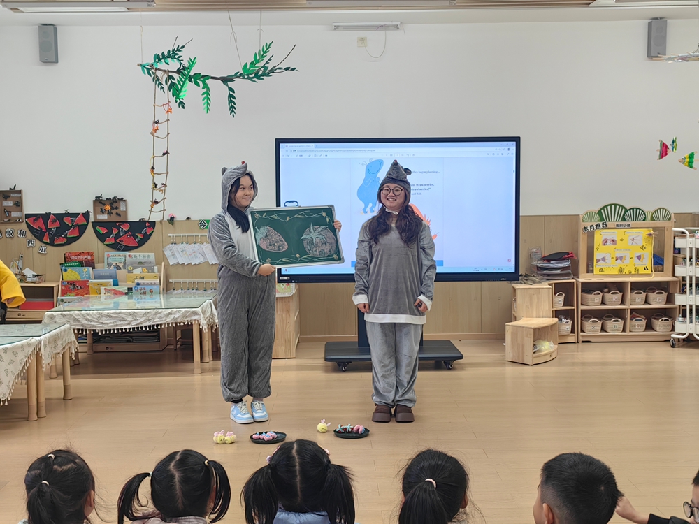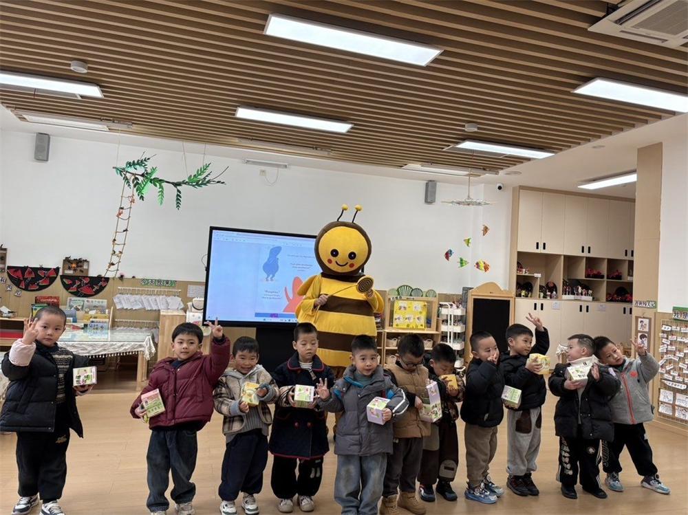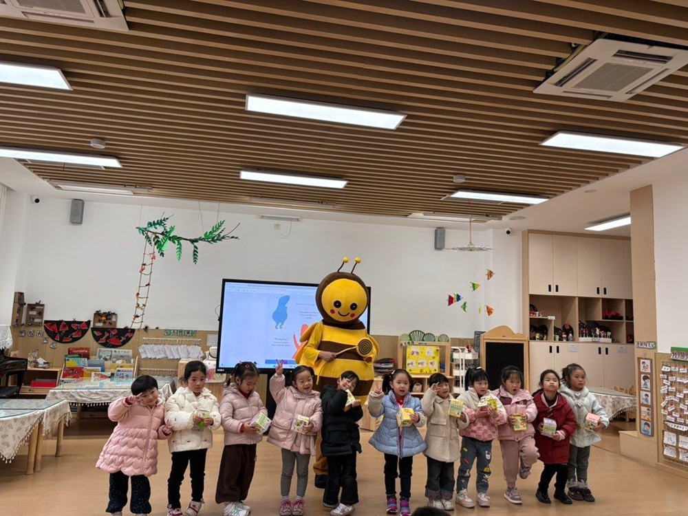 随后,志愿者们扮演绘本角色豚鼠BobGinger和小蜜蜂,生动演绎了故事情节。“小蜜蜂”角色手持玩偶走下舞台,与孩子们进行亲切互动,现场气氛热烈、欢快融洽。活动尾声,志愿者们向每位小朋友赠送小盆栽,寓意“在英语学习的土壤中播下兴趣的种子,静待成长与绽放”,孩子们在温暖氛围和丰硕收获中圆满结束了此次英语欢乐之旅。