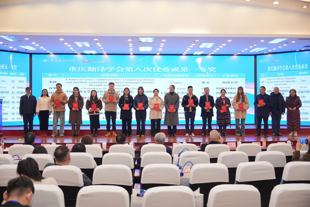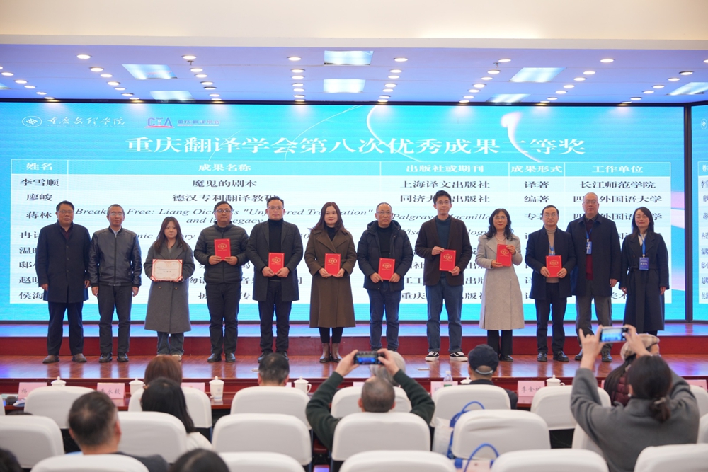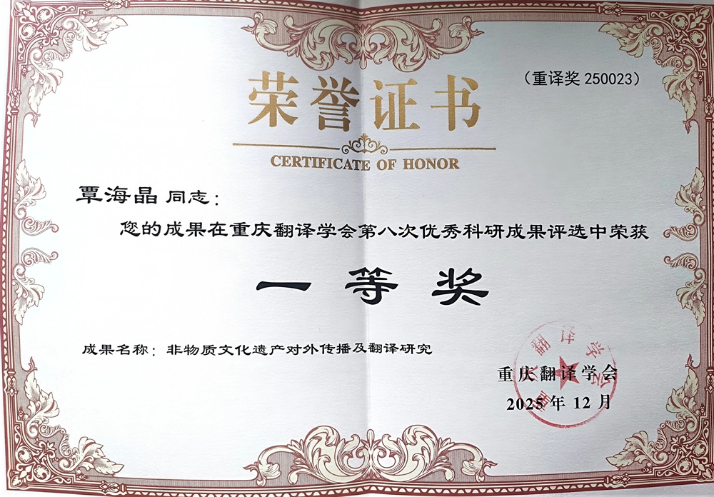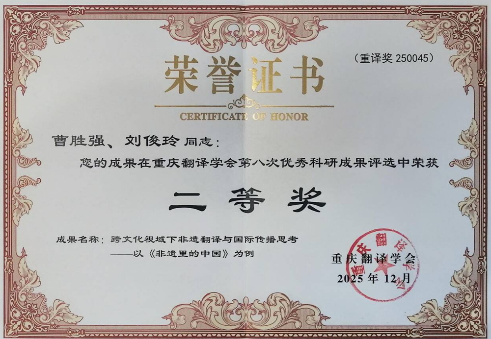 2025年12月26日至28日,在公司举行的重庆翻译学会2025年年会暨第十六届体认翻译学研讨会上,重庆翻译学会第八次优秀科研成果奖正式揭晓。公司覃海晶老师的专著《非物质文化遗产对外传播及翻译研究》荣获一等奖,曹胜强、刘俊玲老师的论文《跨文化视域下非遗翻译与国际传播思考——以<非遗里的中国>为例》荣获二等奖。